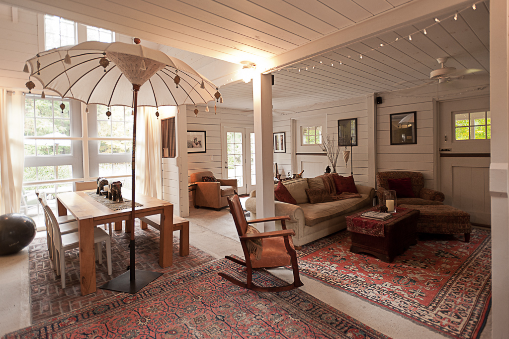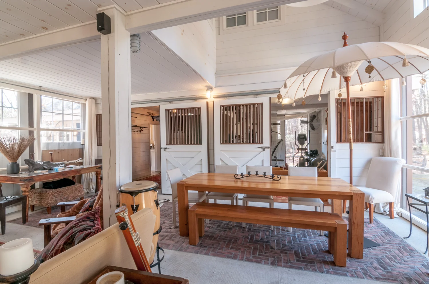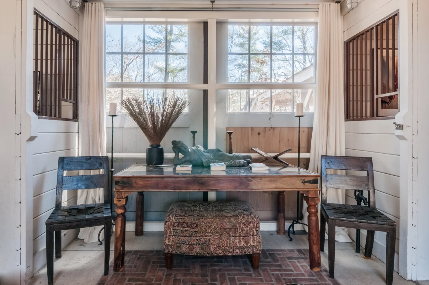 This one-of-a-kind guest house was inspired by its original life as a horse stable. We preserved as many authentic details as possible—barn doors, cement, and brick floors—allowing the home’s history to shine through. The former tack room became a charming kitchenette, while oversized barn doors in the living room now open wide to create seamless indoor-outdoor living. Eclectic pieces from the client’s collection were layered in for a playful, relaxed atmosphere.